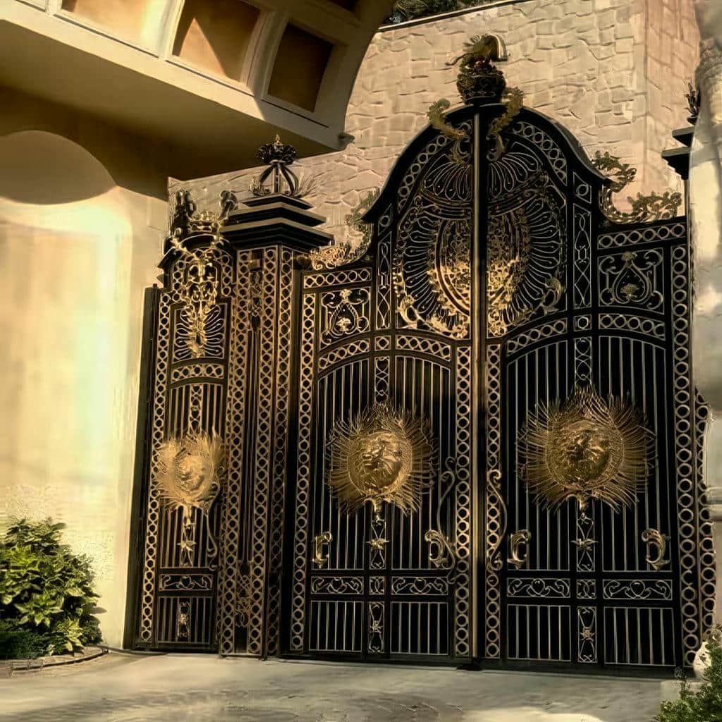 درب حیاط ساختمان لوکس کلاسیک با طراحی الهام گرفته از معماری سنتی و تزئینات فرفورژه که جلوه ای باشکوه به ورودی می دهد.